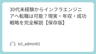 インフラ転職戦略 30代未経験からインフラエンジニアへ転職は可能?現実・年収・成功戦略を完全解説【保存版】 はじめに「30代から未経験でインフラエンジニアは厳しいのでは?」「IT業界は若い人しか採用されないと聞いた…」「今の仕事を続けるべきか、挑戦すべきか分からない」30代という年齢は、キャリアの分岐点です。体力も責任も増え、守るものも増えている... 2026.02.14 インフラ転職戦略
